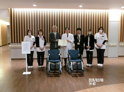 アルミ製車椅子を6台寄贈しました。平成25年から開始し、今回で10回目、累計62台の寄贈となりました。 ※車椅子62台の内、ボンベ台・点滴棒止め付50台、点滴防止め付6台 |